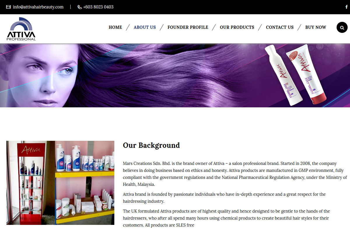Mars Creations Sdn. Bhd. is the brand owner of Attiva – a salon professional brand. Started in 2008, the company believes in doing business based on ethics and honesty. Attiva products are manufactured in GMP environment, fully compliant with the government regulations and the National Pharmaceutical Regulation Agency, under the Ministry of Health, Malaysia.