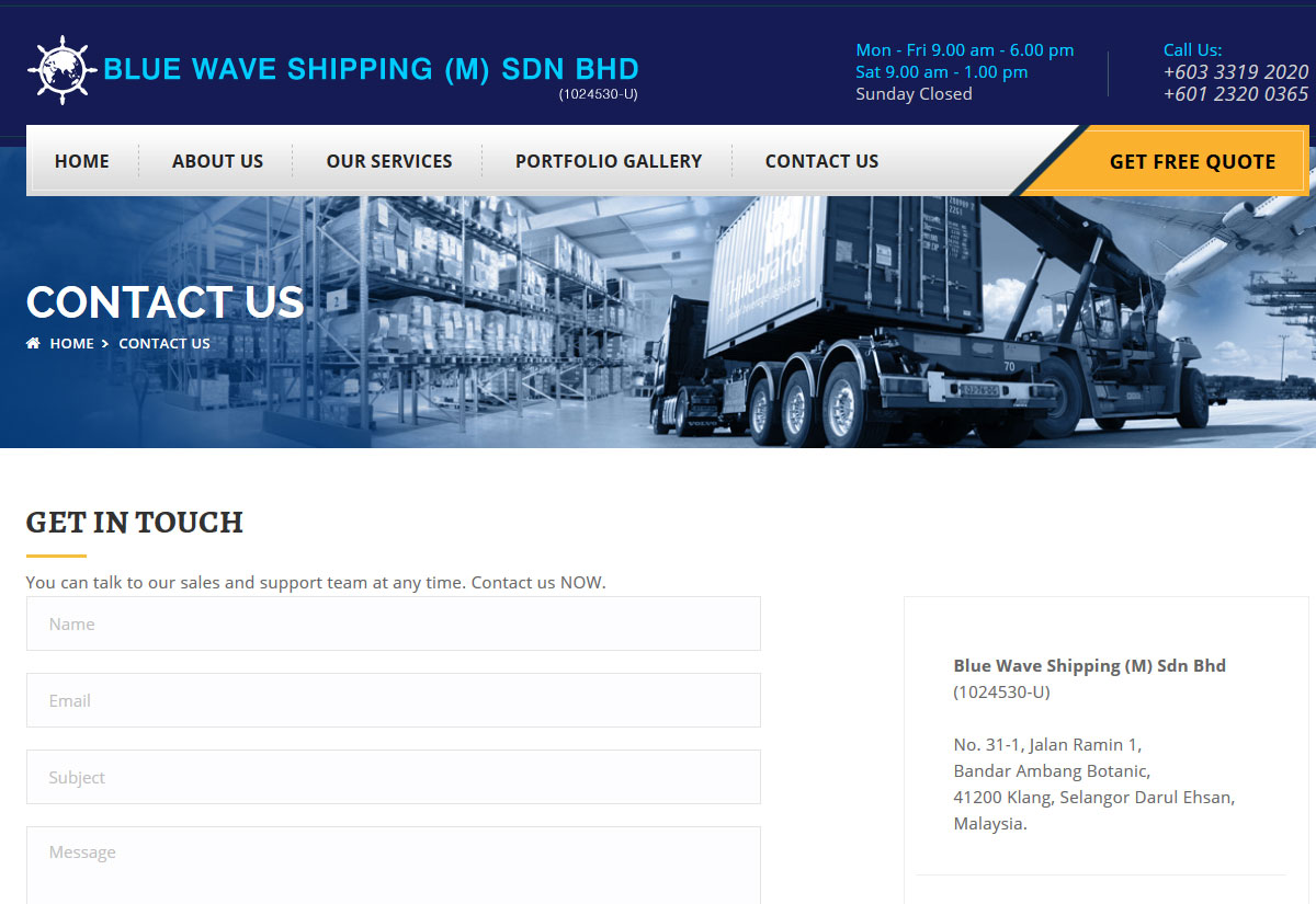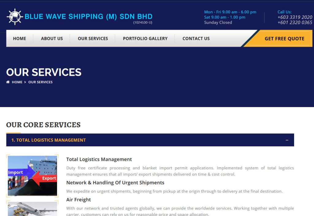 BLUE WAVE SHIPPING (M) Sdn Bhd, provides leading edge logistics solutions since 2012. BLUE WAVE SHIPPING offers a full range of advanced supply chain management solutions in four major areas such as Logistics, Transportation, Marine services and Warehousing.