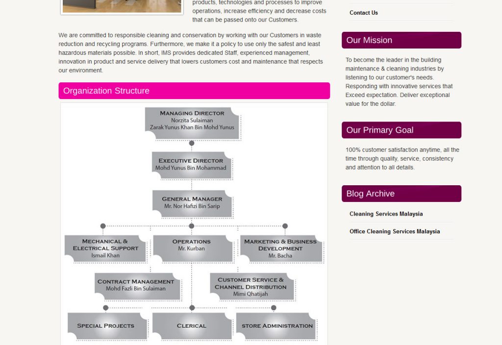 Indah Maintenance Services Sdn Bhd (IMS) is a Bumiputra owned and managed company providing professional janitorial services in the country. Incorporated in the 2005 with over 8 years of on the job experience.
